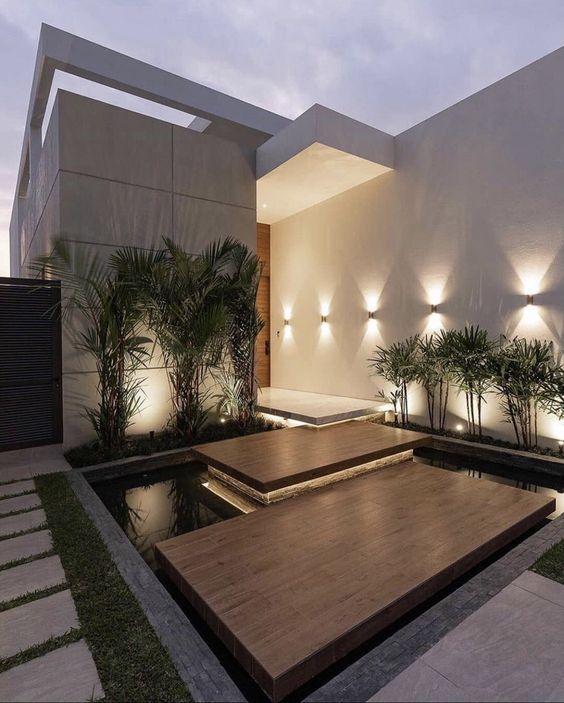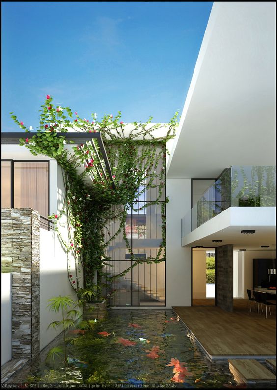 Umumnya dari gerbang menuju entrance hunian digunakan sebagai taman. Tapi, nggak ada salahnya jika kamu mengganti taman kering menjadi taman air dengan menambah kolam ikan pada area ini. Kolam ikan minimalis yang muncul sebagai bagian tak terpisah dari desain rumah bisa kamu jadikan pilihan saat mendesain rumah.
