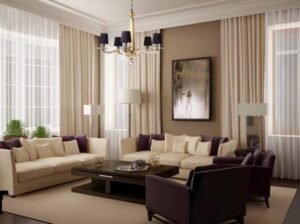 Warna putih yang murni dan cream yang lembut membuat suasana ruangan terasa lebih dingin dan nyaman. Furnitur yang mewah dan material-material yang berkualitas memastikan kenyamanan selama berada di ruangan ini.
