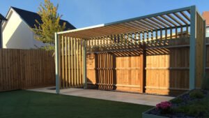 Pergola dapat dibuat dengan bahan besi dengan bentuk yang biasanya persegi panjang. Anda bisa membentuk dan memberikan pola pada pergola agar terlihat lebih estetik.