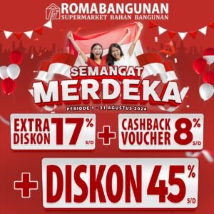 Selamat datang di bulan kemerdekaan! Roma Bangunan dengan bangga mempersembahkan Promo Semangat Merdeka yang akan membuat belanja Anda lebih hemat dan menyenangkan! Mari rayakan Hari Kemerdekaan Indonesia dengan berbagai penawaran istimewa untuk kebutuhan bahan bangunan dan rumah Anda.